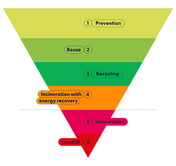 The Lansink scale is a waste management principle that prioritizes waste prevention, followed by reuse, recycling, incineration with energy recovery and finally incineration and landfill.