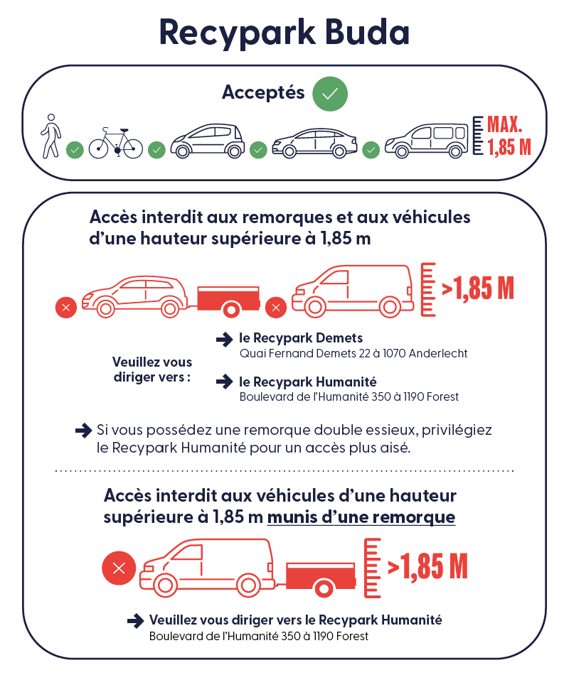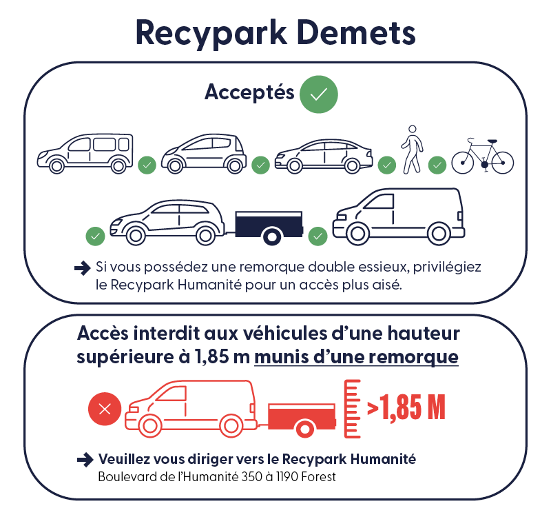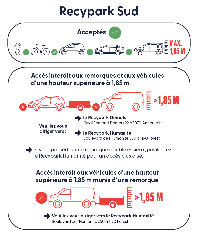 - Les véhicules avec remorque et les véhicules d’une hauteur de plus d’1,85 mètre doivent se rendre au Recypark Humanité.